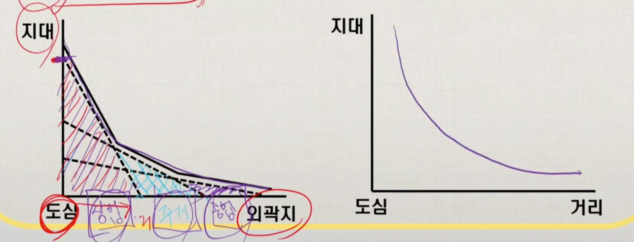 지가는 도심지에서 멀어짐에 따라 감소된다는 것. 중심지까지의 거리와 함수관계가 있는 수송비에 의해 지가가 결정된다는 이론